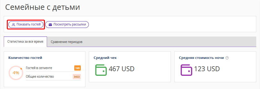 Нажмите кнопку «Показать гостей», чтобы увидеть полный список гостей, которые входят в сегмент.