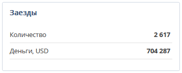 Показывает общее количество заездов за все время и их общую стоимость .