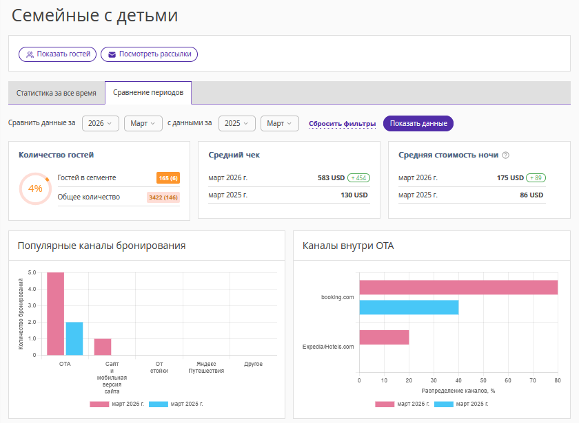 Число в скобках — количество гостей с детьми, которые совершили бронирование во втором периоде, установленном в фильтре.