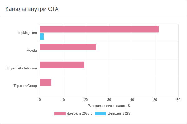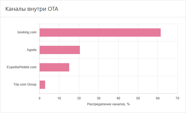 Диаграмма показывает данные о распределении бронирований, которые были совершены через онлайн-туристические агентства (ОТА) за выбранные в фильтре периоды.