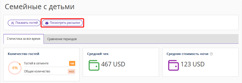 В таблице «Созданные рассылки» будет отображен список рассылок, которые могут быть отправлены гостям из выбранного сегмента. В настройках фильтра автоматически будет установлен выбранный сегмент.