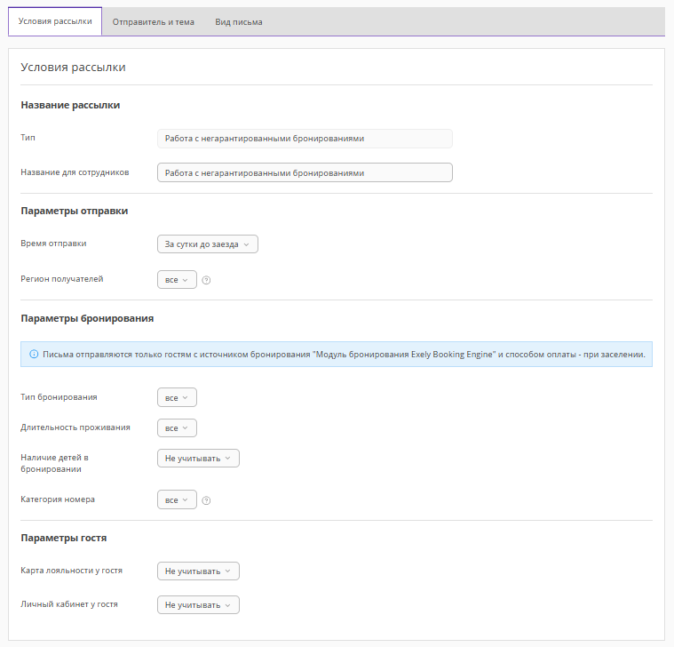 Рассылка «Работа с негарантированными бронированиями» отправляется только тем гостям, которые забронировали проживание на сайте и выбрали «Оплатить при заселении» без внесения предоплаты.