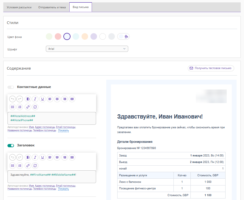 На вкладке «Вид письма» настройте стиль и содержание письма.