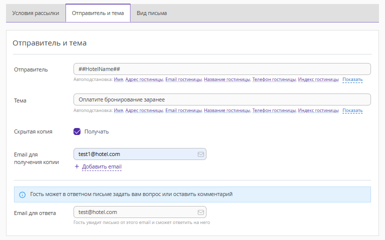 1. На вкладке «Отправитель и тема» укажите отправителя, например, название средства размещения или службы. Используйте автоподстановки.