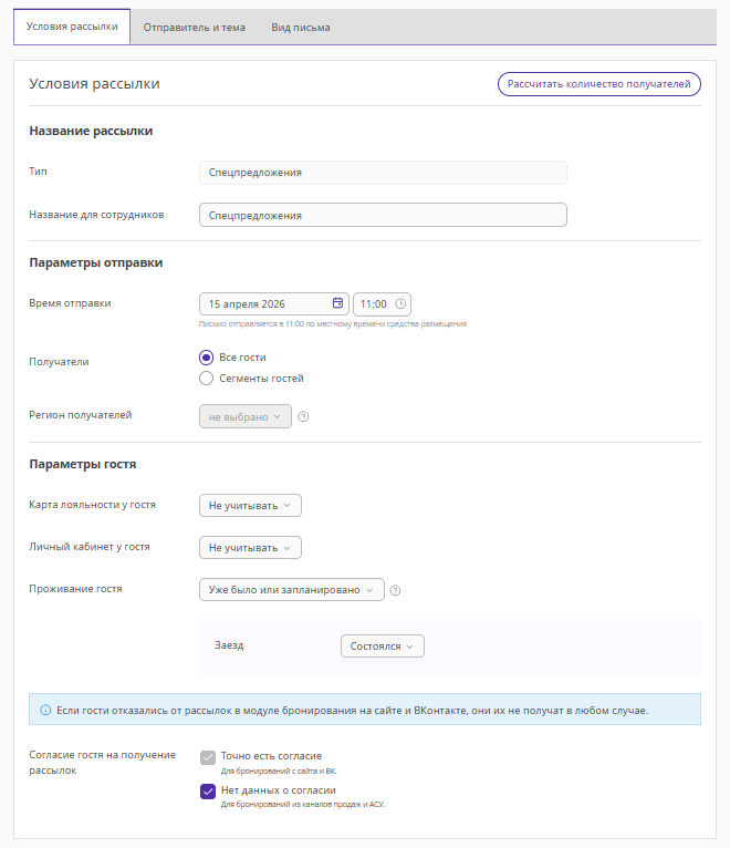 • Гости, которые отказались от рассылок при бронировании на сайте или мобильной версии сайта — не будут получать рассылки при любых настройках.