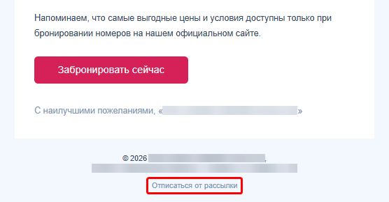 Иногда гости не хотят получать некоторые виды писем или рассылки в целом. Для этого в каждом письме, которое получает гость, есть ссылка «Отписаться от рассылки».