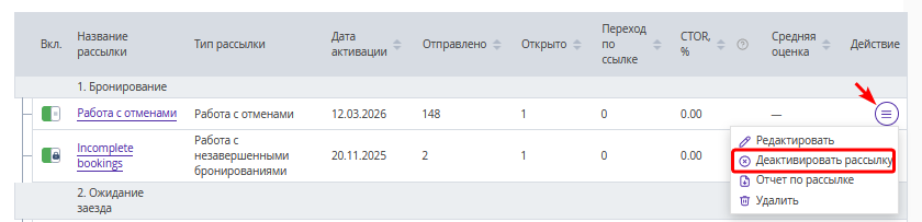 3. В списке рассылок нажмите «Действие» → «Деактивировать рассылку».