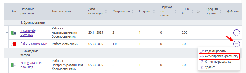 3. В списке созданных рассылок нажмите «Действие» → «Активировать рассылку».
