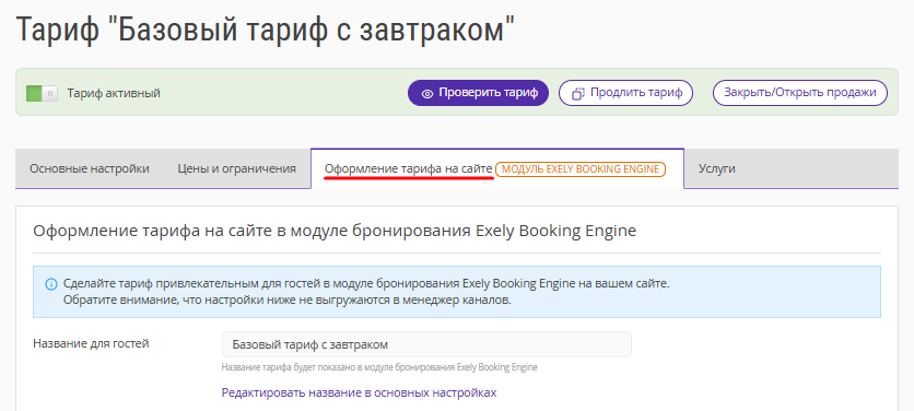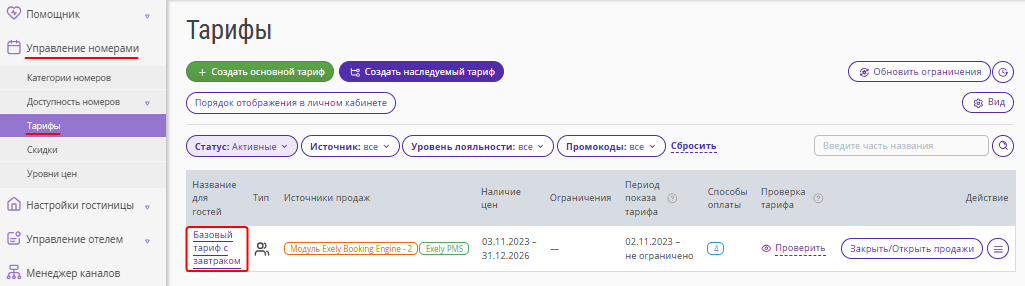 1. В экстранете Exely перейдите в раздел «Управление номерами» → «Тарифы» и выберите нужный тариф в списке.