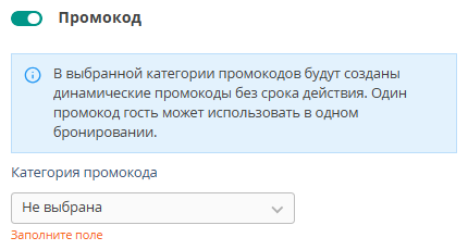 Чтобы активировать блок «Промокод» и отправлять гостям уникальный промокод, создайте категорию промокодов в экстранете Exely в разделе «Настройки гостиницы» → «Промокоды».