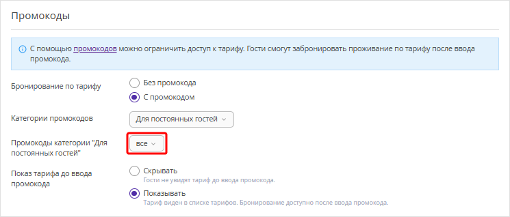 3. При прикреплении промокода к тарифу, выберите категорию и в поле «Промокоды категории» выберите «все».