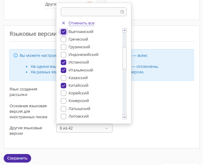 В пункте «Другие языковые версии» в выпадающем списке поставьте галочку напротив языков, на которых планируете делать рассылку.