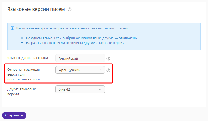 Носителям тех языков, которые не были выбраны для рассылки, будут отправляться письма на языке из пункта «Основная языковая версия для иностранных писем».