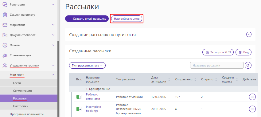 Чтобы отправлять письма на разных языках в экстранете Exely в разделе «Управление гостями» → «Мои гости» → «Рассылки» нажмите «Настройка языков».