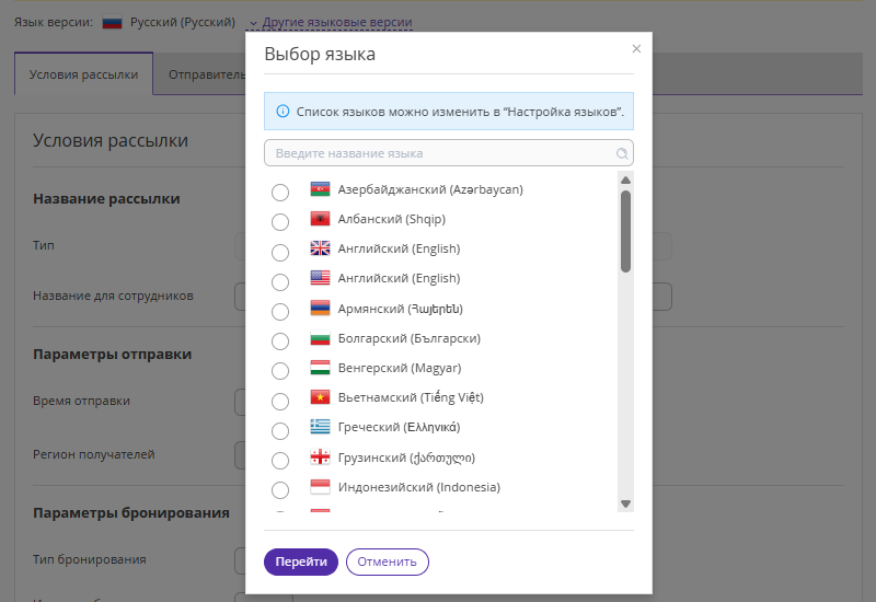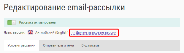 Обратите внимание. Языки, которые были выбраны в пункте «Другие языковые версии» будут соответствовать списку языков при создании рассылки.
