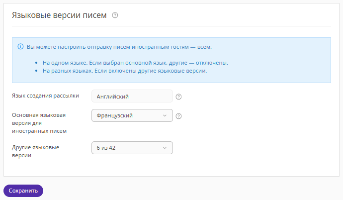 Выбранные настройки языков, будут распространяться на все типы рассылок.