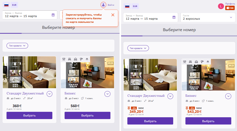 В модуле бронирования: На шаге оформления бронирования гостю будет предложено списать баллы. В подтверждении бронирования будет указана скидка по карте лояльности и сумма списанных баллов.