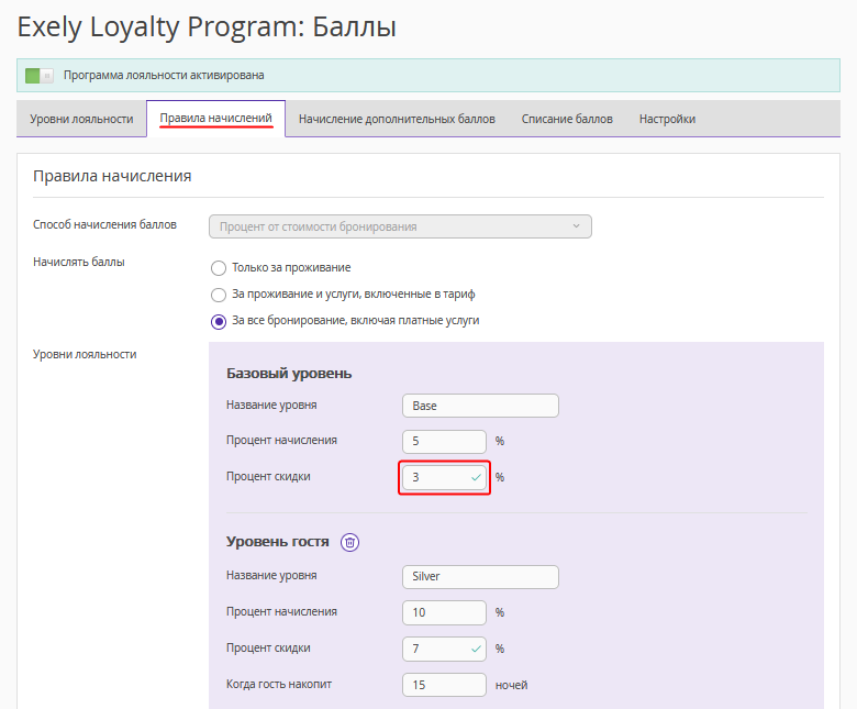 2. На странице настроек для Exely Loyalty Program: Баллы перейдите на вкладку «Правила начислений». В настройках каждого уровня появится поле «Процент скидки».