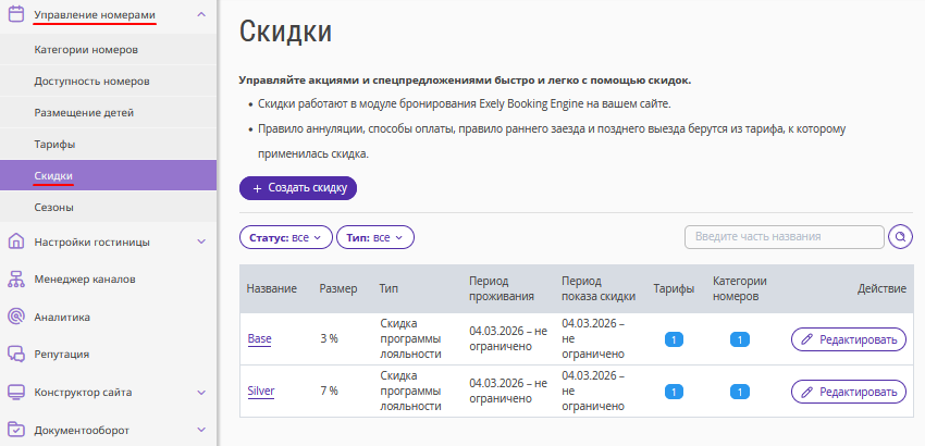 Обратите внимание. После сохранения настроек скидок, в разделе «Управление номерами» → «Скидки» автоматически создаются или обновляются соответствующие правила. Если в поле «Процент скидки» было указано 0, скидка в разделе «Управление номерами» → «Скидки» не отобразится.